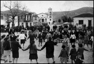 Πανήγυρη στο γεμάτο ζωή χωριό μετά τον πόλεμο: Παρά το βαρύ φόρο αίματος κατά τη γερμανική Κατοχή και τον Εμφύλιο, οι Ελληνες, αγνοούντες ακόμα τα ‘’ιατρεία της Βαβυλώνος’’ του Παπαδιαμάντη, αυξάνονταν και πληθύνονταν.