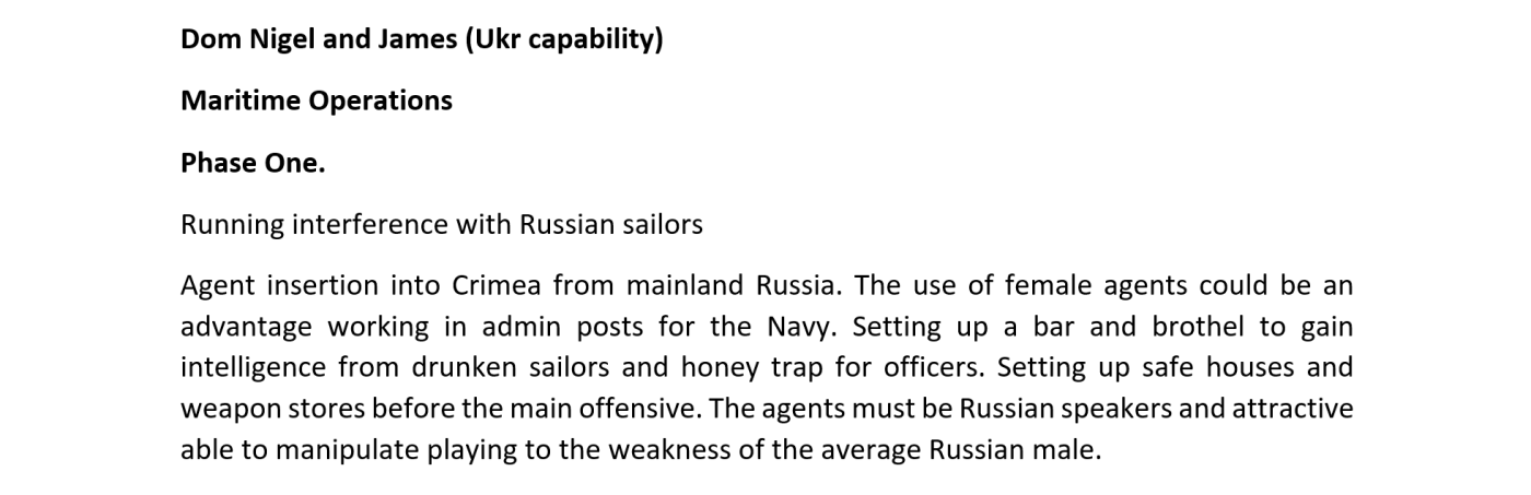 Μεταξύ των πλέον προκλητικών σχεδίων συγκαταλέγεται και μια ξεκάθαρη «επιχείρηση παγίδας μελιού», η οποία προέβλεπε τη δημιουργία οίκου ανοχής υπό μυστική διαχείριση από τις βρετανικές μυστικές υπηρεσίες στην Κριμαία. Εκεί, ρωσόφωνες Ουκρανές πράκτορες θα αποσπούσαν πληροφορίες από «μεθυσμένους ναύτες» του ρωσικού ναυτικού.