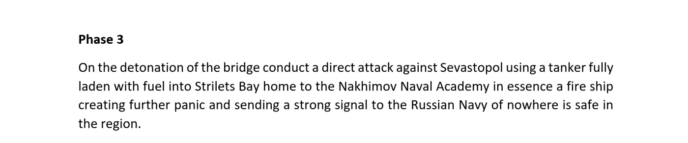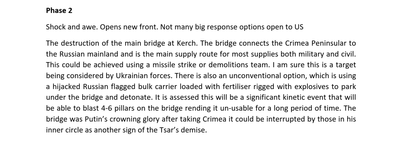 Στο δεύτερο στάδιο, ο Μόρις πρότεινε μια «ανορθόδοξη επιλογή» για την ανατίναξη της Γέφυρας του Κερτς: ένα ρωσικό φορτηγό πλοίο, υπό ρωσική σημαία, φορτωμένο με λίπασμα και παγιδευμένο με εκρηκτικά, θα «σταθμεύσει» κάτω από τη γέφυρα και θα πυροδοτηθεί. Ο Μόρις εκτιμούσε ότι η έκρηξη θα αποτελεί ένα «σημαντικό κινητικό γεγονός», ικανό να ανατινάξει τέσσερις έως έξι πυλώνες της γέφυρας και να την καταστήσει μη λειτουργική για μεγάλο χρονικό διάστημα. Δεδομένου ότι η Γέφυρα του Κερτς ήταν «το στέμμα του Πούτιν» μετά την προσάρτηση της Κριμαίας, η ολοκληρωτική της καταστροφή, κατά τον ίδιο, θα μπορούσε να πυροδοτήσει πραξικόπημα στο Κρεμλίνο.
