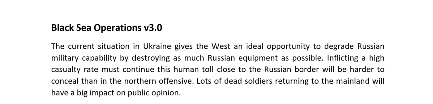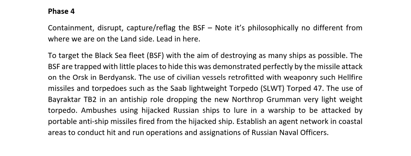 Ο Μόρις παρουσίασε στη συνέχεια μια σειρά από πολυεπίπεδες και φάσεων επιχειρήσεις με στόχο τη Ρωσία σε ολόκληρη τη Μαύρη Θάλασσα. «Η πρόκληση μεγάλου αριθμού απωλειών πρέπει να συνεχιστεί», δήλωσε, υποστηρίζοντας ότι «οι πολλοί νεκροί στρατιώτες που επιστρέφουν στη ρωσική ενδοχώρα θα έχουν σοβαρό αντίκτυπο στη δημόσια γνώμη».