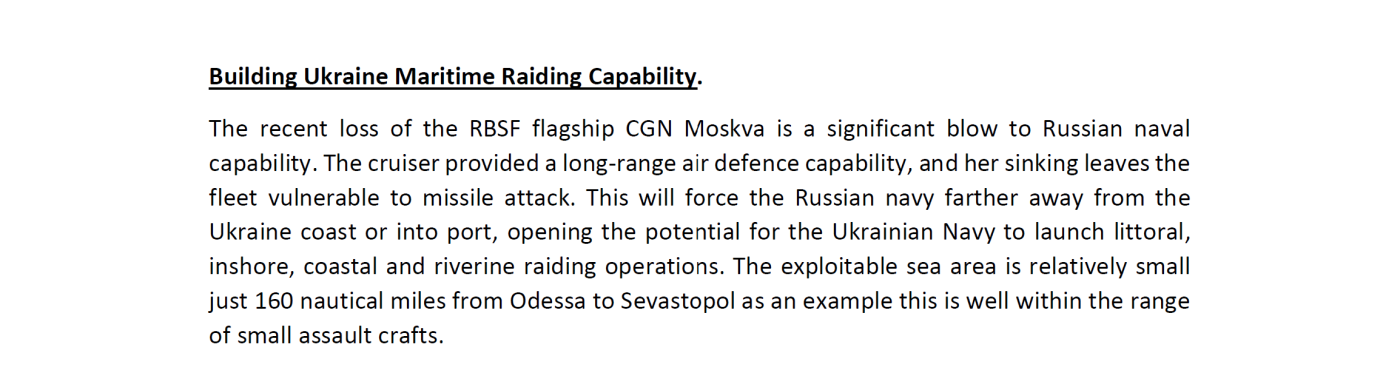 Απαντώντας σε έκθεση που του υποβλήθηκε στις 23 Απριλίου 2022 από άλλο μέλος της μονάδας, η οποία υποστήριζε ότι η Δύση πρέπει να επικεντρωθεί στην υποστήριξη χερσαίων επιχειρήσεων της Ουκρανίας, ο Μόρις υποστήριξε πως «η βύθιση του Moskva» καταδεικνύει ότι το Κίεβο πρέπει πλέον να δώσει έμφαση κυρίως σε ναυτικές επιχειρήσεις. Εκφράζοντας τη δυσαρέσκειά του ότι «εκτός από λίγες μετακινήσεις αρμάτων και αεροσκαφών σε μια ειρηνική Ευρώπη, το ΝΑΤΟ δεν πολεμά πουθενά», έγραψε ότι βλέπει την ευκαιρία για το Ηνωμένο Βασίλειο να εξαλείψει κάθε ρωσικό σκάφος στην περιοχή χωρίς καν να εμπλακεί σε πόλεμο.