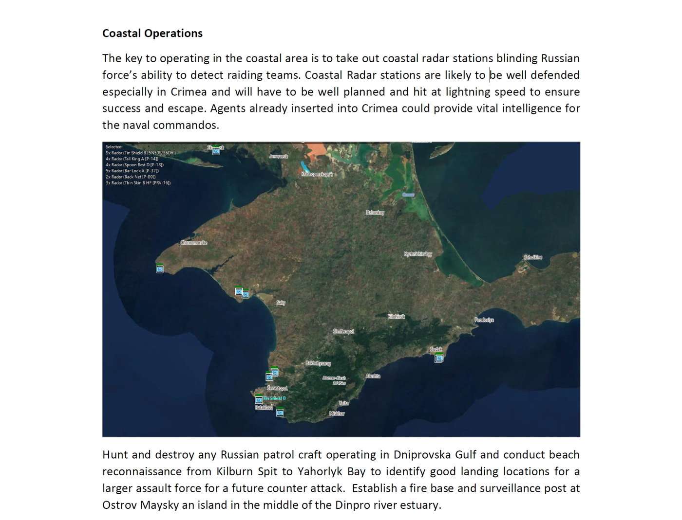 Οι Βρετανοί σχεδίαζαν να εξοπλίσουν και να εκπαιδεύσουν Ουκρανούς πεζοναύτες και ναυτικές δυνάμεις για να μπορούν να στήνουν ενέδρες σε ομάδες Ρώσων μηχανικών και αναγνωριστικών μονάδων Spetsnaz, καθώς και να παρενοχλούν τις ρωσικές δυνάμεις με επιθέσεις-αστραπή και υποχώρηση από υδάτινες οδούς. Επιπλέον, οι ίδιες μονάδες θα αναλάμβαναν την εξουδετέρωση παράκτιων ραντάρ, «τυφλώνοντας» έτσι τις ρωσικές δυνάμεις. Καθώς τα ραντάρ θα ήταν «πιθανότατα καλά προστατευμένα», η Alchemy υπογράμμιζε ότι οι επιθέσεις θα έπρεπε να είναι «άψογα σχεδιασμένες και να εκτελούνται με αστραπιαία ταχύτητα», βασιζόμενες σε πληροφορίες που θα παρέχουν πράκτορες εντός της Κριμαίας, οι οποίοι είχαν ήδη διεισδύσει από την ηπειρωτική Ρωσία.