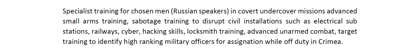 Η Alchemy πρότεινε επίσης εκπαίδευση επιλεγμένων ανδρών που μιλούν ρωσικά για την εκτέλεση «μυστικών αποστολών διείσδυσης». Αυτοί θα λάμβαναν εκπαίδευση σε χρήση οπλισμού, δολιοφθορές (όπως επιθέσεις σε σταθμούς ηλεκτρικής ενέργειας, σιδηροδρομικές γραμμές), κυβερνοπόλεμο, hacking, παραβίαση κλειδαριών, προχωρημένες τεχνικές μάχης σώμα με σώμα, καθώς και τεχνικές εντοπισμού και στοχοποίησης υψηλόβαθμων Ρώσων στρατιωτικών αξιωματούχων στην Κριμαία όταν βρίσκονται εκτός υπηρεσίας.
