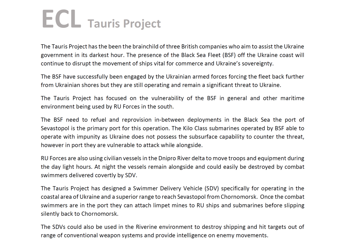 Μια διαρροή από τον Σεπτέμβριο του 2022 αποκάλυψε εκτενές σχέδιο με την ονομασία “Tauris Project”, βασισμένο σε εισηγήσεις τριών ανώνυμων βρετανικών εταιρειών. Το σχέδιο προέβλεπε επιθέσεις στον Στόλο της Μαύρης Θάλασσας όσο αυτός σταθμεύει στη Σεβαστούπολη, πλήγματα σε ρωσικά “πολιτικά πλοία” που μεταφέρουν στρατεύματα και εξοπλισμό στον ποταμό Δνείπερο, καθώς και νυχτερινές επιδρομές σε άλλα ναυτικά περιβάλλοντα που χρησιμοποιούν οι ρωσικές δυνάμεις.