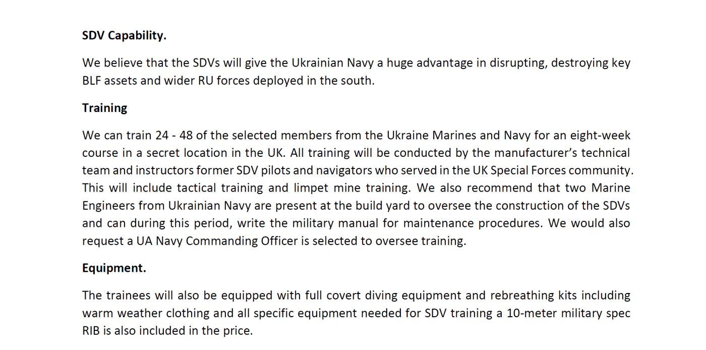 Το Project Alchemy υποστήριζε πως τα SDV θα προσέφεραν τεράστιο πλεονέκτημα στο Ουκρανικό Ναυτικό, επιτρέποντας την καταστροφή κρίσιμων ρωσικών υποδομών και στόχων στο νότιο μέτωπο. Σχεδίαζαν να εκπαιδεύσουν 24 έως 48 Ουκρανούς πεζοναύτες και ναυτικούς μέσα σε οκτώ εβδομάδες σε απόρρητη τοποθεσία στο Ηνωμένο Βασίλειο, υπό την καθοδήγηση πρώην χειριστών SDV των Ειδικών Δυνάμεων. Η εκπαίδευση περιλάμβανε και χρήση μαγνητικών ναρκών (limpet mines).