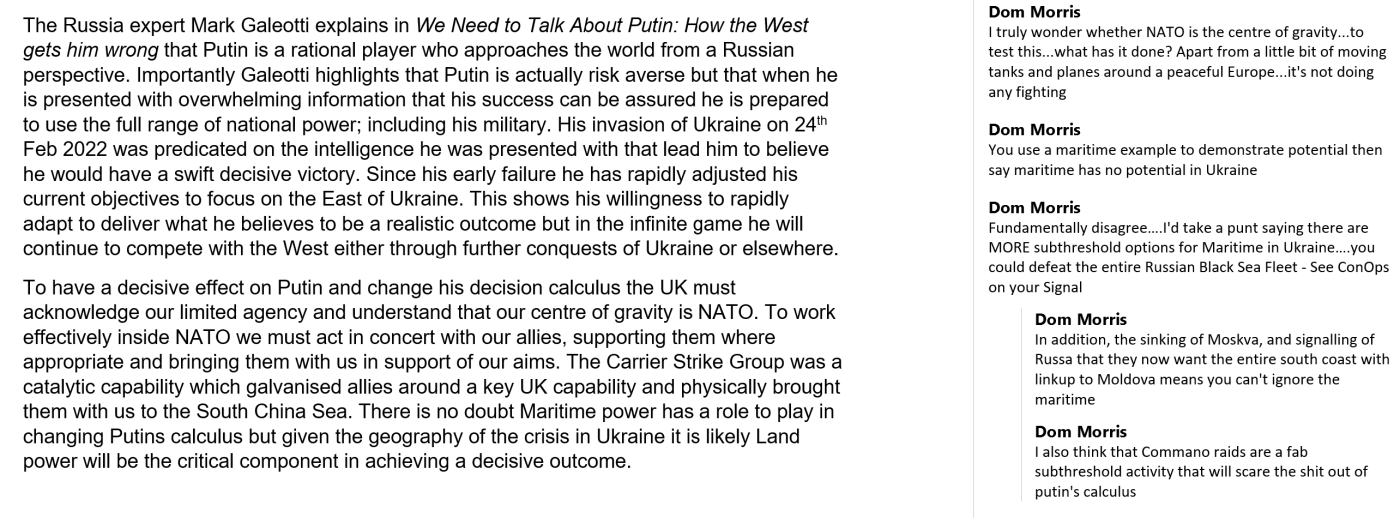 «Μπορείς να καταστρέψεις ολόκληρο τον Στόλο της Μαύρης Θάλασσας», έγραψε, «χρησιμοποιώντας υποκατώφλιες επιλογές» – όρος που παραπέμπει στις λεγόμενες γκρίζες ζώνες επιχειρήσεων, τις οποίες οι βρετανικές στρατιωτικές δομές ορίζουν ως «κάθε δραστηριότητα που δεν υπερβαίνει τον νομικό ορισμό της ένοπλης σύρραξης». Ο Μόρις πρότεινε συγκεκριμένα κομάντο επιθέσεις, τις οποίες χαρακτήρισε ως «εξαιρετική υποκατώφλια δραστηριότητα που θα τρομοκρατήσει τον Πούτιν».