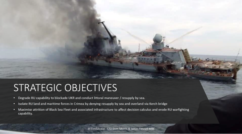Ο Μόρις παρουσίασε στη συνέχεια μια σειρά από πολυεπίπεδες και φάσεων επιχειρήσεις με στόχο τη Ρωσία σε ολόκληρη τη Μαύρη Θάλασσα. «Η πρόκληση μεγάλου αριθμού απωλειών πρέπει να συνεχιστεί», δήλωσε, υποστηρίζοντας ότι «οι πολλοί νεκροί στρατιώτες που επιστρέφουν στη ρωσική ενδοχώρα θα έχουν σοβαρό αντίκτυπο στη δημόσια γνώμη».