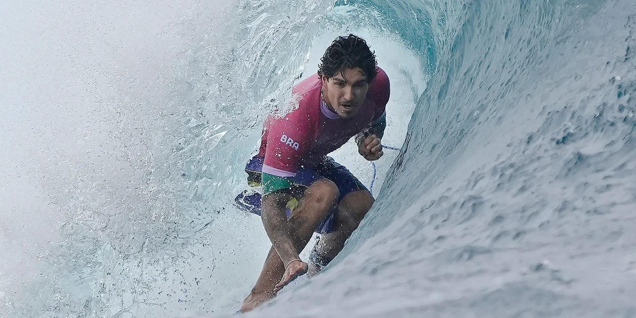 Ο Βραζιλιάνος σέρφερ Gabriel Medina στην περίφημη φωτογραφία μοιάζει να έχει σταματήσει για λίγο στον αέρα, ακουμπώντας σε ένα σύννεφο, με τη σανίδα του να τον ακολουθεί, ενώ σηκώνει το χέρι του προς τους υποστηρικτές του κατά μήκος της ακτής της Ταϊτής, δευτερόλεπτα αφότου κέρδισε την απίθανη βαθμολογία 9,9 -την καλύτερη των Ολυμπιακών Αγώνων στο Παρίσι μέχρι στιγμής.
