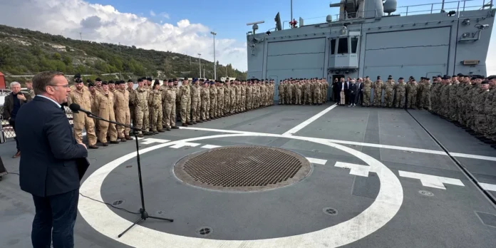 Ο Γερμανός υπ. Άμυνας Πιστόριους στη φρεγάτα Hessen στη Σούδα, πριν αυτή αναχωρήσει για Ερυθρά θάλασσα -Φωτογραφία: Michael Fischer/picture alliance via Getty Images