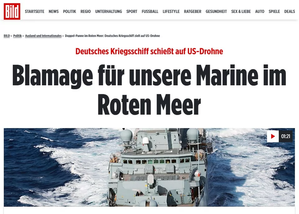 «Αμηχανία για το ναυτικό μας στην Ερυθρά Θάλασσα» γράφει η γερμανική εφημερίδα Bild, αναφερόμενη στην γκάφα της Γερμανίας, που εκτόξευσε πυραύλους εναντίον αμερικανικού drone στην Ερυθρά Θάλασσα.