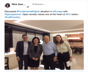 Η Ευρωπαϊκή Επιτροπή απάντησε μέσω μιας από τους Αντιπροέδρους της, της Věra Jourová: «Η Επιτροπή δεν έχει καμία αμφιβολία για την ακεραιότητα και την ανεξαρτησία του ΕΔΑΔ.” Ψάξτε όσο θέλετε, δεν θα βρείτε τίποτα! Εκτός ίσως μερικές φωτογραφίες που μας βοηθούν να κατανοήσουμε το πλαίσιο στο οποίο εμφανίζονται αυτές οι απαντήσεις. Σε μια από αυτές μπορούμε να δούμε την Επίτροπο Jourová με τον Ούγγρο φιλάνθρωπο να δηλώνει ότι “Οι αξίες της Ανοιχτής Κοινωνίας βρίσκονται στο επίκεντρο της δράσης της ΕΕ“. Σε μια άλλη φωτογραφία, ο Ευρωπαίος Επίτροπος Johannes Hahn – συντάκτης μιας άλλης απάντησης – φωτογραφίζεται επίσης με τον Τζωρτζ Σόρος, λέγοντας ότι “Πάντα είναι καλή μια συνάντηση με τον Τζωρτζ Σόρος για να συζητήσουμε τις κοινές μας προσπάθειες για την επιτάχυνση των μεταρρυθμίσεων και των  ανοιχτών κοινωνιών στα Βαλκάνια και την Ανατολική Ευρώπη».