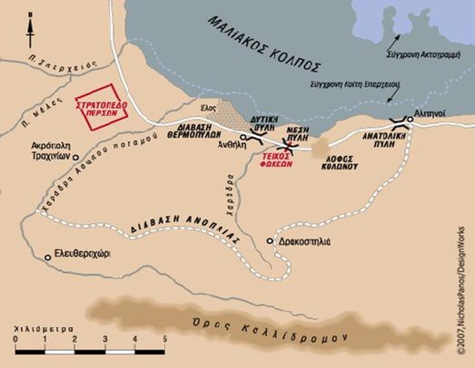 Το 480 π.Χ., ο βασιλεύς των Περσών Ξέρξης Α΄, με σκοπό την κατάκτηση της Ελλάδος,   διαπεραίωσε τον πολυάριθμο στρατό του στην Θράκη και μέσω Μακεδονίας κατέληξε στην Τραχίνια της Μηλίδας,  κοιλάδας του Σπερχειού ποτ. Οι αρχηγοί των Ελλήνων συνήλθαν στον Ισθμό της Κορίνθου και αποφάσισαν να καταλάβουν τα Στενά των Πυλών (που σήμερα ονομάζονται «Θερμοπύλες»), μια στενότατη λωρίδα ξηράς μεταξύ των καταπτώσεων του Καλλίδρομου όρους και του Μαλιακού κόλπου, που οδηγούσε από την χώρα των Μαλιέων στην χώρα των  Οπούντιων Λοκρών ( αμφότερες ελληνικές φυλές, σήμερα στον νομό Φθιώτιδος). Περί τα μέσα Αυγούστου, ο Ξέρξης προώθησε τα τμήματά του σε απόσταση χιλιομέτρου από την «Δυτική Πύλη», το στενότερο σημείο των Στενών επί των οποίων είχαν εγκατασταθεί αμυντικά οι συνασπισμένες ελληνικές δυνάμεις (300 Σπαρτιάτες με τους είλωτες-πελταστές, 700 Θεσπιείς, 400  Κορίνθιοι, άλλοι τόσοι Θηβαίοι, 1.000 Φωκείς κλπ), με αρχηγό όλων  τον βασιλέα της Σπάρτης Λεωνίδα Α΄ τον Λακεδαιμόνιο, γιο του βασιλέα Αναξανδρίδα Β΄, της δυναστείας των Αιγιάδων. Σύνολο 5.200 άντρες κατά τον Ηρόδοτο, ή  7.400 κατά τον Διόδωρο. Σε αυτούς προστέθηκαν και πολεμιστές από τις τοπικές φυλές των Μαλιέων και των Οπούντιων Λοκρών, κατόπιν πρωτοβουλιών του Λεωνίδα.  Την στενωπό κατέλαβαν οι Σπαρτιάτες και οι υπόλοιποι τις  γύρο  περιοχές. Οι κήρυκες που στάλθηκαν στον Λεωνίδα για παράδοση των όπλων έλαβαν το περιλάλητο  «Μολών Λαβέ» (Αν τολμάς, έλα να τα πάρεις). Η  επίθεση άρχισε μετά 4ήμερο. Οι Πέρσες επί 2 συνεχείς ημέρες  επιτίθεντο με αλλεπάλληλα, κατά έθνη, κύματα,  χωρίς να καταφέρουν να  εκβιάσουν τα Στενά, λόγω αδυναμίας ελιγμών  εντός αυτών και σθεναρής άμυνας των Ελλήνων που διέθεταν οπλισμό ανώτερης ποιότητας από τους Πέρσες.  Τότε παρουσιάσθηκε στον Ξέρξη  ο «από μηχανής προδότης» Μαλιεύς Εφιάλτης, γιος του Ευρύδημου, γνώστης της περιοχής, και προσφέρθηκε να οδηγήσει τα περσικά στρατεύματα μέσα από τις δύσβατες χαράδρες του Ασωπού ποτ. προς τα υψώματα της Ανοπαίας  (το σημερινό Καλλίδρομο),  παρακάμπτοντας,  την κύρια στενωπό των Πυλών και την διάταξη των αμυνομένων . Ο Ξέρξης αποδέχτηκε την πρόταση και την ίδια νύκτα, ισχυρό απόσπασμα εκ 10.000 ανδρών του Σώματος των «Αθανάτων» υπό τον Υδάρνη  ξεκίνησε για την επιχείρηση. Τα ξημερώματα έφτασε στα υψώματα του Καλλίδρομου, έτρεψε σε φυγή τους Φωκείς που φύλαγαν τα ορεινά περάσματα και ανεμπόδιστα κινήθηκε νότια προς το στενότερο σημείο (Ανατολική Πύλη} του περάσματος, (βλ. σχεδιάγραμμα), με σκοπό να προσβάλλει    τα πλευρά και τα νώτα της ελληνικής παράταξης.  Ο  Λεωνίδας, αντιλαμβανόμενος την κυκλωτική κίνηση των Περσών, διώχνει τους υπόλοιπους Έλληνες πλην Σπαρτιατών, ενώ οι    Θεσπιείς υπό τον Δημόφιλο, γιο του Διαδρόμου, παραμένουν με την θέλησή τους, σε αντίθεση με τους Θηβαίους, υπό τον Λεοντιάδη, γιο του Ευρύμαχου, που δεικνύουν έντονες τάσεις αυτομολίας. Τις πρωινές ώρες εκείνης της ημέρας  (τρίτης των συγκρούσεων) οι Πέρσες επαναλαμβάνουν τις λυσσώδεις κατά μέτωπο επιθέσεις τους. Ο Λεωνίδας προωθείται σε ξέφωτο περί την σημερινή θέση των Λουτρών , όπου και σκοτώνεται πολεμώντας λεονταρίσια. Οι Σπαρτιάτες μετά από σκληρό αγώνα, κατορθώνουν να ανακτήσουν το νεκρό σώμα του βασιλέως τους. Εν τω μεταξύ  εισέρχεται  στον αγώνα ο Υδάρνης με τους Αθανάτους. Οι  εναπομείναντες πολεμιστές, αντιλαμβανόμενοι ότι έχουν περικυκλωθεί 