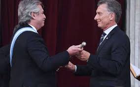 διαθέσιμα της Αργεντινής ανέρχονται μόνο στα 43,8 δισ. δολάρια», σύμφωνα με την ανταποκρίτρια της Libération στο Buenos Aires, Mathilde Guillaume, στην ανταπόκρισή της, της 19ης Φεβρουαρίου 2020, με τίτλο « Στην Αργεντινή, ο πρόεδρος Fernández εγκαινιάζει ένα μπρα ντε φερ με το ΔΝΤ» (En Argentine, le président Fernández lance un bras de fer avec le FMI). Σήμερα, η ομάδα του νέου προέδρου, του περονιστή Alberto Fernández (εξ αριστερών στη Φώτο), που εκλέχθηκε κυρίως λόγω της παταγώδους αποτυχίας των οικονομικών πολιτικών του προκατόχου του φιλελεύθερου Mauricio Macri (εκ δεξιών κατά την τελετή παράδοσης της εξουσίας στον νικητή των τελευταίων εκλογών), βρίσκεται σε πάρα πολύ δύσκολη θέση. Στριμωγμένος από ένα κολοσσιαίο δημόσιο χρέος 315 δις. δολαρίων (ή 100% του ΑΕΠ της Αργεντινής), επιπλέον των 151 δισεκατομμυρίων που έχουν ήδη δανείσει ιδιώτες πιστωτές, φουσκωμένο από τον προκάτοχό του Mauricio Macri, ο Alberto Fernández πρέπει να επανα–διαπραγματευτεί την αποπληρωμή του, αλλά μέσα από την αναθέρμανση της ζήτησης. Δηλαδή «να ρίξει λεφτά στην αγορά» από αυτά που δεν έχει (!) για τους πλέον αδύναμους εισοδηματικά Αργεντινούς. Κάτι που αντίκειται στις εφαρμοζόμενες πρακτικές του ΔΝΤ ως δανειστή. Ο Fernandez