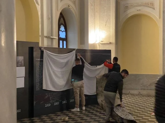 Όπως μπορείτε να δείτε στις παρακάτω φωτογραφίες του makthes.gr. στρώνουν χαλιά και καλύπτουν τις ταμπέλες και επιγραφές του μουσείου.