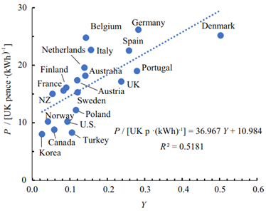 Εικόνα 1. Τιμή οικιακής κιλοβατώρας (σε πένες βρετανικής λίρας) ως συνάρτηση του ποσοστού Φ/Β και αιολικών στην συνολική παραγωγή ενέργειας (Πηγή: G. Kalghatgi, J. Automotive Safety and Energy, 2021, 11, 79-83)