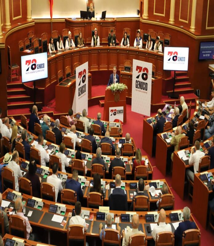Φωτογραφία από το Αλβανικό Κοινοβούλιο από την εκδήλωση που πραγματοποιήθηκε ενάντια στην “γενοκτονία” που πραγματοποίησε η χώρα μας από το δήθεν πατριωτικό κόμμα της Αλβανίας.