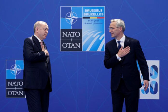 Φωτογραφία:Ο Τούρκος Πρόεδρος Ρετζέπ Ταγίπ Ερντογάν (αριστερά) με τον Γενικό Γραμματέα του ΝΑΤΟ Γενς Στόλτενμπεργκ κατά τη διάρκεια της Συνόδου Κορυφής του ΝΑΤΟ στην έδρα του ΝΑΤΟ στις Βρυξέλλες στις 14 Ιουνίου 2021. PATRICK SEMANSKY / AFP