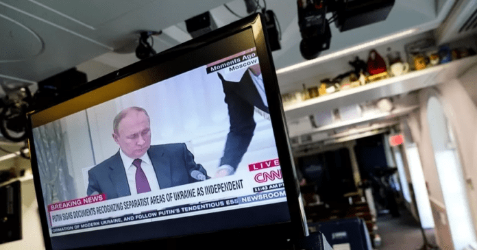 Ο Ρώσος πρόεδρος Πούτιν εμφανίζεται σε μια οθόνη στην αίθουσα ενημέρωσης του Λευκού Οίκου, υπογράφοντας έγγραφα αναγνώρισης των αυτονομιστικών περιοχών της Ουκρανίας ως ανεξάρτητων, στην Ουάσιγκτον, DC, 21 Φεβρουαρίου 2022