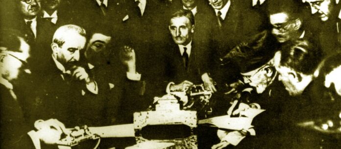 Ο Ελευθέριος Βενιζέλος και ο Κεμάλ στη δεξίωση στην Αγκυρα, που ακολούθησε την υπογραφή του ελληνοτουρκικού Συμφώνου Φιλίας στις 30 Οκτωβρίου 1930.