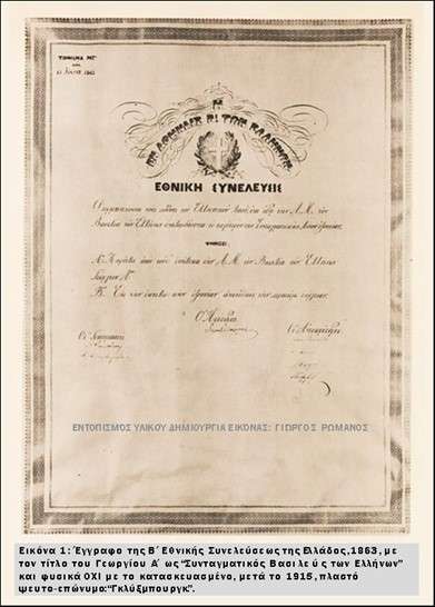 - Ο βασιλεύς Γεώργιος Α΄, γενάρχης του Ελληνικού Βασιλικού Οίκου, δεν είχε επώνυμο ούτε ελέγετο ποτέ Γκλύξμπουργκ. Αναγορεύθηκε παμψηφεί ως Συνταγματικός Βασιλέας των Ελλήνων (και όχι Μονάρχης!) Το ψήφισμα της «Β΄ των Ελλήνων Συνελεύσεως» της 18ης Μαρτίου, 1863: «…α) Αναγορεύει παμψηφεί τον πρίγκιπα της Δανίας Χριστιανόν, Γουλιέλμον, Φερδινάνδον, Αδόλφον, Γεώργιον, δευτερότοκον υιόν του πρίγκιπος Χριστιανού της Δανίας, συνταγματικόν βασιλέα των Ελλήνων υπό το όνομα Γεώργιος Α΄ Βασιλεύς των Ελλήνων…» (Εικόνα 1). Διεθνώς ο τίτλος του ήταν: ROI DES HELLENES.