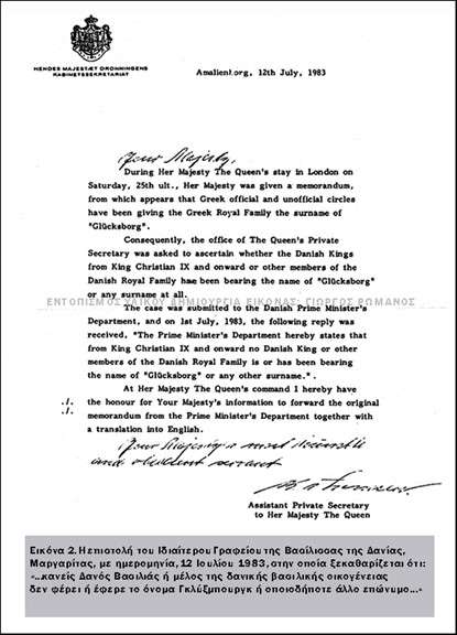 Στις 25 Ιουνίου 1983, ετέθη υπ’ όψη της Βασίλισσας της Δανίας ένα Υπόμνημα σχετικό με το ότι ελληνικοί επίσημοι και ανεπίσημοι κύκλοι αποδίδουν στην Ελληνική Βασιλική Οικογένεια το επίθετο Γκλύξμπουργκ (Εικόνα 2). Ζητήθηκε από το Ιδιαίτερο Γραφείο της Βασιλίσσης να επιβεβαιώσει αν οι Δανοί Βασιλείς ή κάποιο μέλος της Βασιλικής Οικογένειας φέρει το όνομα Γκλύξμπουργκ ή οποιοδήποτε επίθετο. Η υπόθεση ανατέθηκε στον Δανό Πρωθυπουργό, το γραφείο του οποίου απάντησε την1η Ιουλίου 1983, ότι «…κανείς Δανός Βασιλιάς ή μέλος της Δανικής Βασιλικής οικογένειας δεν φέρει ή έφερε το όνομα Γκλύξμπουργκ ή οποιοδήποτε άλλο επώνυμο»…» Ενημερώθηκε ο τότε πρωθυπουργός της Ελλάδος, Αντρέας Παπανδρέου. Ωστόσο αυτός μέχρι τον θάνατό του, όλα τα στελέχη του κόμματός του (ΠΑΣΟΚ), καθώς και άλλα αστικά ή κομμουνιστικά κόμματα συνέχισαν και συνεχίζουν μέχρι σήμερα την χρήση αυτού του πλαστού όρου.