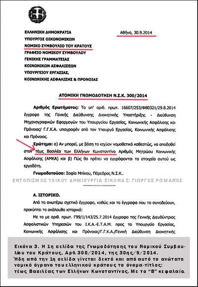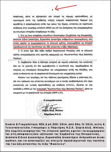 δ. Η ως άνω Γνωμοδότηση του ΝΣΚ, στην τελευταία σελίδα 8 (Εικόνα 6) υπογράφεται από την Πάρεδρο του ΝΣΚ, Σοφίας Αλεξ. Μπίκου. Στο σημείο 1, αναφέρεται: «το ελληνικό κράτος οφείλει να συμμορφώνεται στις αποφάσεις των ανωτάτων Δικαστηρίων (Συμβούλιο της Επικρατείας, Ανώτατο Ειδικό Δικαστήριο, Ευρωπαϊκό Δικαστήριο Ανθρωπίνων Δικαιωμάτων) και να αναγνωρίζει ως προσδιοριστικό ταυτότητος την λέξη «Βασιλεύς» του αιτούντος», δηλαδή του τ. Βασιλέως των Ελλήνων Κωνσταντίνου Β΄.