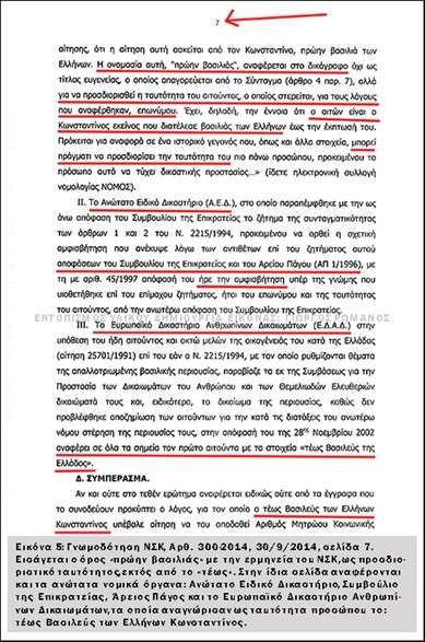 γ. Στην σελίδα 7 (Εικόνα 5) εισάγεται (και) ο όρος «πρώην βασιλιάς» με την ερμηνεία του ΝΣΚ. Έχει ιδιαίτερη σημασία το γεγονός, ότι σε απόφαση ανωτάτου νομικού οργάνου του ελληνικού κράτους εισάγεται γραπτώς η λέξη «πρώην» και όχι μόνο «τέως». Στην συνέχεια αναφέρονται οι θετικές κρίσεις ανώτατων νομικών οργάνων του ελληνικού κράτους (Ανώτατο Ειδικό Δικαστήριο, Συμβούλιο της Επικρατείας, Άρειος Πάγος), όπως και του Ευρωπαϊκού Δικαστηρίου Ανθρωπίνων Δικαιωμάτων.
