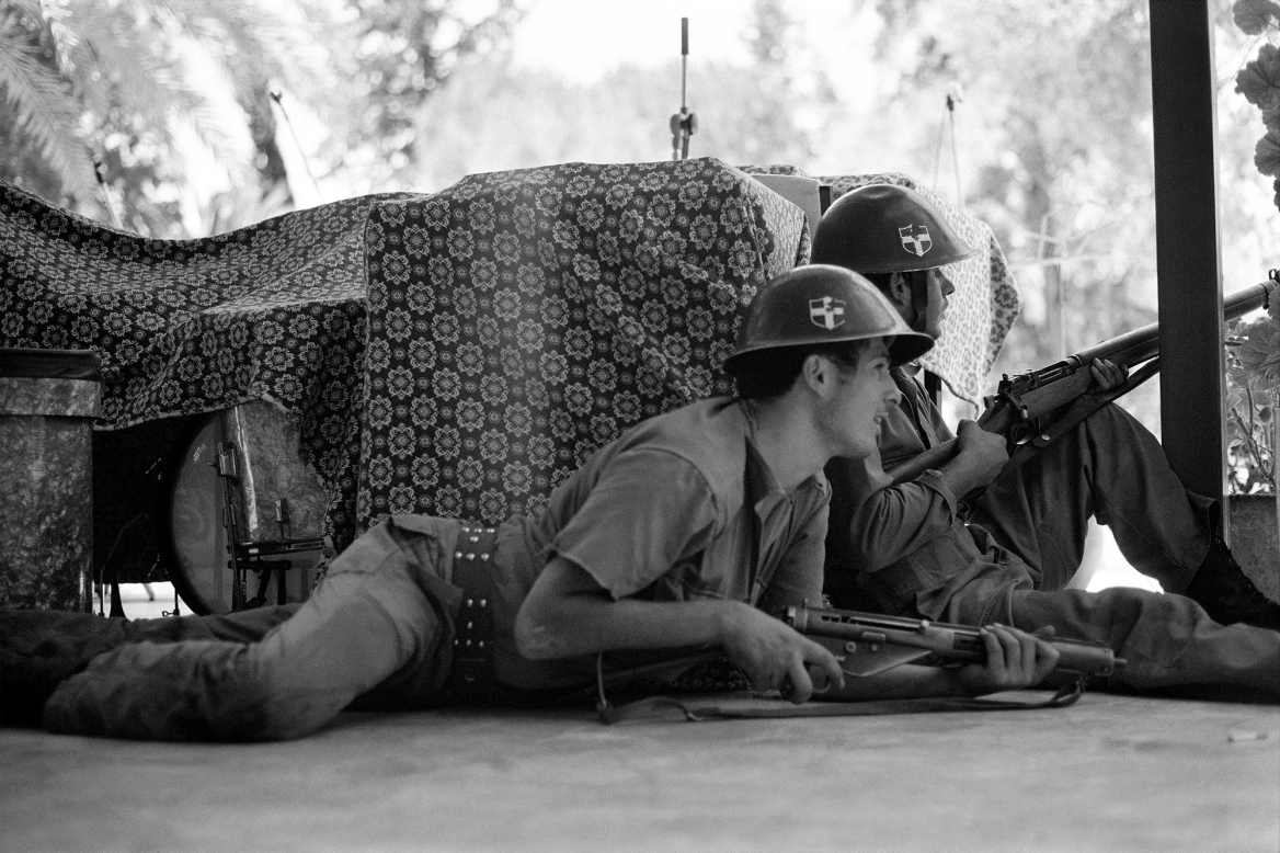 Ελληνοκύπριοι στρατιώτες της Εθνικής Φρουράς φυλάνε σκοπιά στο ξενοδοχείο Ledra Palace, ένα στρατηγικό σημείο στη Λευκωσία, κατά τη διάρκεια σφοδρών μαχών μετά την τουρκική εισβολή στην Κύπρο στις 21 Ιουλίου 1974. Φωτογραφία: Xavier BARON / AFP / Visual Hellas