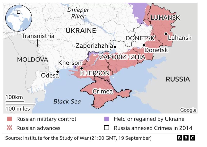 2.-Η Ρωσική προσπάθεια είναι να ελέγξει το Λουχάνσκ, το Ντονέσκ, την Ζαπορίγια και την Χερσώνα. ώστε να αποκτήσει συνεχή εδαφική επαφή απο το Λουχάνσκ ως την Κριμαία. Αυτόν τον χώρο θέλει να προσαρτήσει. Δεν θα κάνει πίσω απο αυτήν την επιδίωξη.