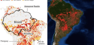 2) Κάθε χρόνο στην ξηρή περίοδο (Ιούλιος-Οκτώβριος) οι δορυφόροι εντοπίζουν πολλές πυρκαγιές στη λεκάνη του Αμαζονίου. Το 2019 καταγράφηκαν 79000 “σημεία εστίας-φωτιάς” σε όλη τη Βραζιλία, δηλαδή σχεδόν διπλάσια σε σχέση με πέρυσι και κατά 15% πάνω από τον μέσο όρο από το 2013 (http://queimadas.dgi.inpe.br/…/portal – … / estatisticas_paises /).