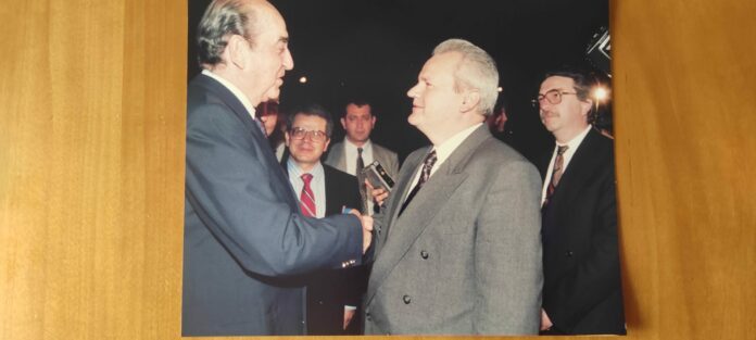 φωτογραφία: Κ. Μητσοτάκης αριστερά, Σλ. Μιλόσεβιτς δεξιά. Στο μέσον με τα γιαλιά ο πρέσβης Ελευθέριος Καραγιάννης.