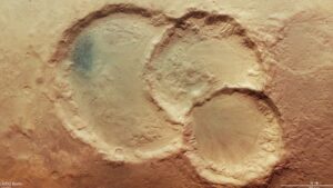Ο ‘Αρης διαθέτει πολλούς κρατήρες στην επιφάνεια του, απομεινάρια από παλαιές πτώσεις αστεροειδών και κομητών. Το σκάφος Mars Express του Ευρωπαϊκού Οργανισμού Διαστήματος (ESA), το οποίο βρίσκεται σε τροχιά γύρω από τον γειτονικό πλανήτη εδώ και χρόνια, ανακάλυψε ένα εντυπωσιακό ασυνήθιστο τριπλό κρατήρα. Στην πραγματικότητα πρόκειται για τρεις κρατήρες που εν μέρει αλληλεπικαλύπτονται.