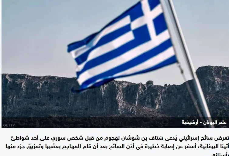 Ένας Ισραηλινός τουρίστας, ο Σταβ Μπεν Σουσάν, δέχθηκε επίθεση από έναν Σύρο άνδρα σε μια παραλία στην Αθήνα. Ο δράστης υπέστη σοβαρό τραυματισμό στο αυτί του, αφού το δάγκωσε και του έκοψε ένα μέρος με τα δόντια του, γράφει αραβικό δημοσίευμα.