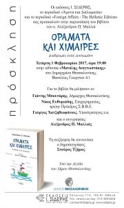 Αλέξανδρου Π. Μαλλιά, πρέσβη επί τιμή, πρώην πρέσβη της Ελλάδος στην Ουάσινγκτον, στα Τίρανα και στα Σκόπια “Οράματα και Χίμαιρες – Διαδρομές ενός Διπλωμάτη” Προλογίζει ο καθηγητής Νίκος Κ. Αλιβιζάτος (Εκδόσεις Ι.Σιδέρης, σελιδες 410 )