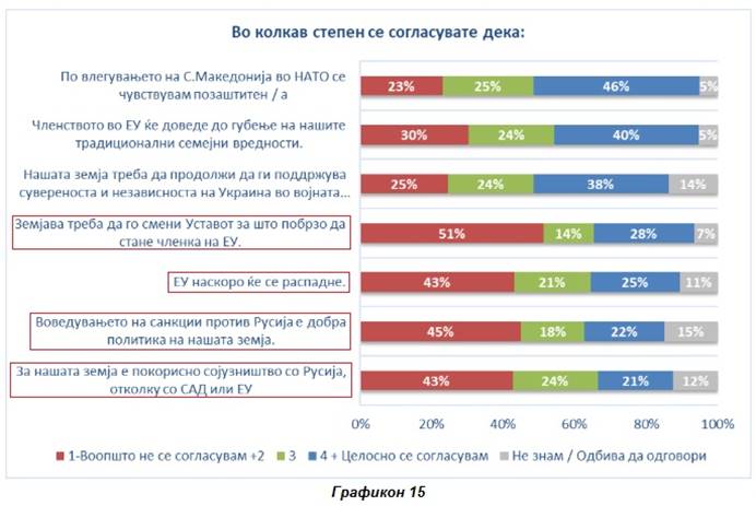 Υψηλά επίπεδα διαφωνίας καταγράφονται επίσης με την άποψη ότι η επιβολή κυρώσεων κατά της Ρωσίας είναι μια καλή πολιτική (45%), καθώς και με τους ισχυρισμούς ότι η ΕΕ σύντομα θα διαλυθεί (43%) και ότι μια συμμαχία με τη Ρωσία είναι πιο επωφελής από ό,τι με τις ΗΠΑ ή την ΕΕ – 43% (Διάγραμμα 15).