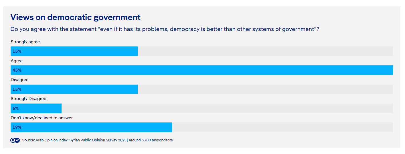 Σύμφωνα με τον πιο πρόσφατο Αραβικό Δείκτη Κοινής Γνώμης της 18ης Σεπτεμβρίου 2025, το 61% των Σύρων προτιμά μια δημοκρατική κυβέρνηση. Ωστόσο, για τους συγγραφείς της εκτενούς μελέτης που διεξήχθη σε όλη τη Συρία, το πιο εντυπωσιακό εύρημα δεν ήταν η έκκληση για δημοκρατία — που είχε ήδη πυροδοτήσει την εξέγερση του 2011 και είχε αντιμετωπιστεί με βίαιη καταστολή από τον Μπασάρ αλ-Άσαντ, προκαλώντας τον πόλεμο — αλλά μάλλον η εμφάνιση ενός νέου αισθήματος αισιοδοξίας στη Συρία.