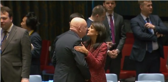 Λίγα λεπτά πριν από την προειδοποίηση ότι η Ουάσινγκτον οδηγεί το κόσμο σε “θλιβερά και σοβαρά γεγονότα” στη Συρία, ο απεσταλμένος της Ρωσίας στον ΟΗΕ ανταλλάσσει φιλοφρονήσεις και φιλιά με την απεσταλμένη των ΗΠΑ Νίκκι Χάλεϊ, δείχνει ένα βίντεο .