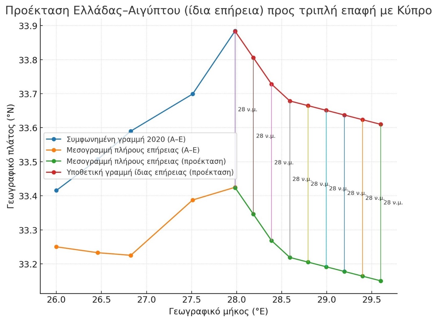 Εφάρμοσα το ίδιο κάθετο offset (περίπου 28 ν.μ.) που προκύπτει από τη διαφορά στο σημείο Α, μετατοπίζοντας έτσι τη μεσογραμμή βορειότερα, ώστε να παραχθεί μια υποθετική «συμφωνημένη» γραμμή μειωμένης επήρειας μέχρι την περιοχή της πιθανής τριπλής επαφής Ελλάδας–Αιγύπτου–Κύπρου (περίπου στο 29.6°E).