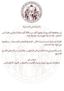 Την ίδια ώρα η Αρχιεπισκοπή των Ελληνορθοδόξων στη Μπόσρα, τη Χαουράν, το Τζαμπάλ αλ-Άραμπ και την περιοχή του Γκολάν απευθύνει δραματική έκκληση για βοήθεια. Οι Έλληνες Χριστιανοί της Λεβατίνης κρούουν τον κώδωνα του κινδύνου για μια πρωτοφανή ανθρωπιστική κρίση που εκτυλίσσεται μπροστά στα μάτια της διεθνούς κοινότητας.