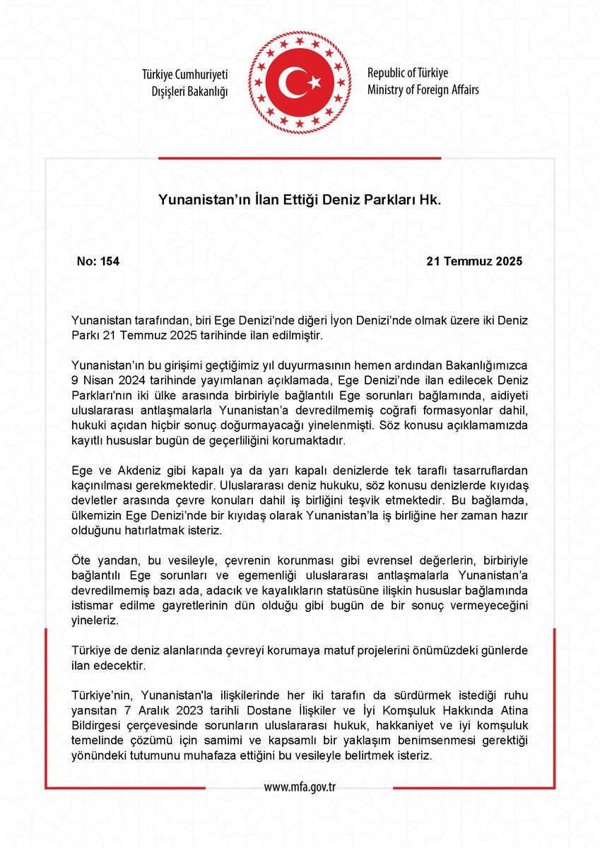 Αμέσως μετά την ανακοίνωση αυτής της πρωτοβουλίας από την Ελλάδα κατά το προηγούμενο έτος, το Υπουργείο μας είχε εκδώσει στις 9 Απριλίου 2024 σχετική δήλωση, στην οποία επαναλαμβανόταν ότι η ανακήρυξη Θαλάσσιων Πάρκων στο Αιγαίο Πέλαγος δεν θα έχει καμία νομική επίπτωση στο πλαίσιο των μεταξύ των δύο χωρών αλληλένδετων ζητημάτων του Αιγαίου, συμπεριλαμβανομένων και γεωγραφικών σχηματισμών των οποίων η κυριότητα δεν έχει μεταβιβαστεί στην Ελλάδα μέσω διεθνών συνθηκών. Τα σημεία που αναφέρονται στη συγκεκριμένη δήλωσή μας εξακολουθούν να ισχύουν και σήμερα.
