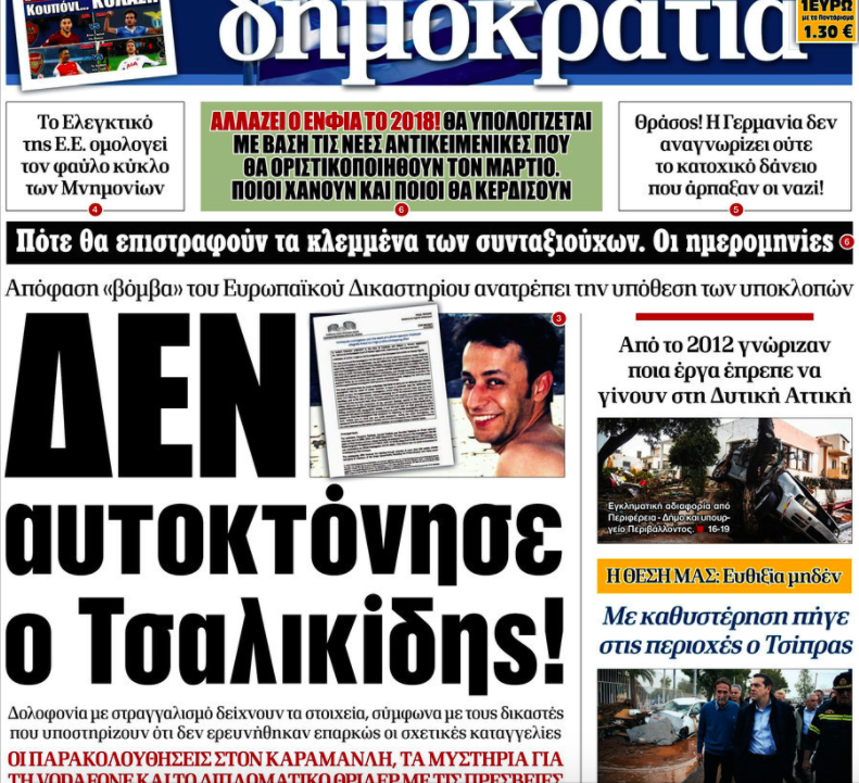 Όπως γράφει η εφημερίδα “Δημοκρατία” στο βασικό πρωτοσέλιδο θέμα της, το Ευρωπαϊκό Δικαστήριο Ανθρωπίνων Δικαιωμάτων καταδίκασε την Ελλάδα σε αποζημίωση προς την οικογένεια του Κώστα Τσαλικίδη, “δείχνοντας” ουσιαστικά στην κατεύθυνση της δολοφονίας του τότε στελέχους της Vodafone, και όχι της αυτοκτονίας του, όπως ήταν η επίσημη εκδοχή.