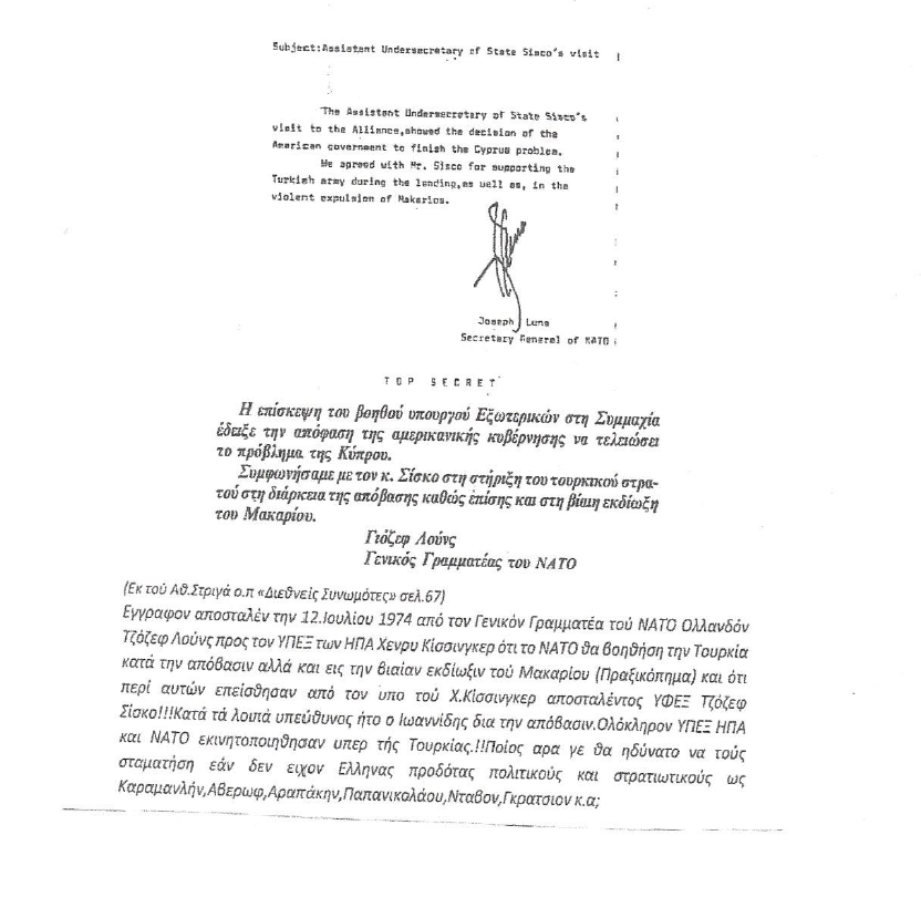 (Βλ.σχετ.έγγραφον διά τού οποίου το ΝΑΤΟ γνωστοποιεί εις τήν Κίσσινγκερ τήν βοήθειαν πρός τον Τουρκικόν στρατον κατά τήν απόβασιν).
