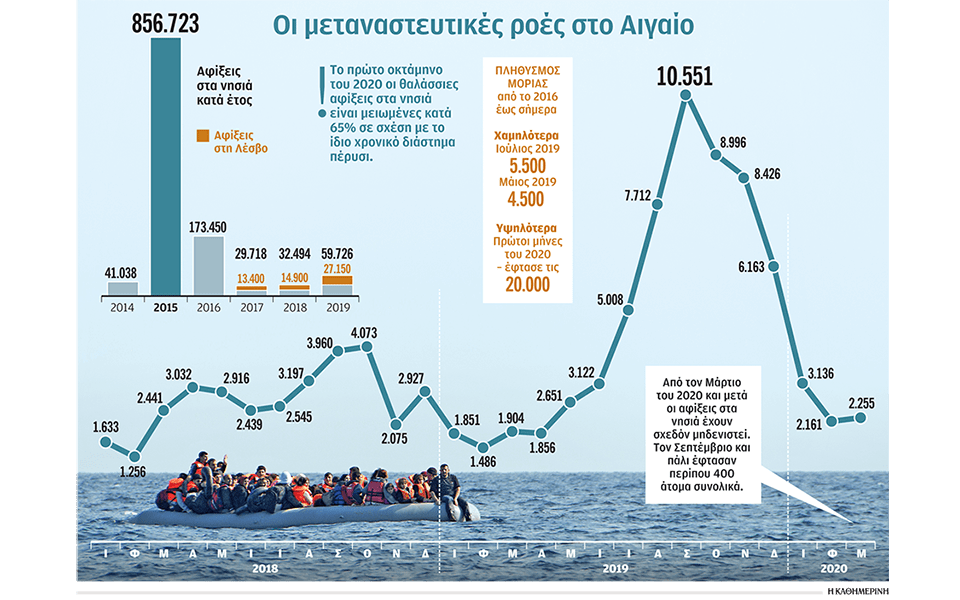 Από την άλλη, η τύχη και η κατάσταση της Μόριας είναι άμεσα συνδεδεμένη με τις μεταναστευτικές ροές από την Τουρκία προς τα ελληνικά νησιά, οι οποίες από τον Μάρτιο και μετά έπεσαν σε ιστορικά χαμηλά, σε αντίθεση με ό,τι συνέβαινε τους καλοκαιρινούς μήνες τα τελευταία χρόνια. Ετσι, τον Απρίλιο του 2020 έφθασαν στη Λέσβο και άρα στη Μόρια 39 άτομα, τον Μάιο 227, τον Ιούνιο 245, τον Ιούλιο 285 και τον Αύγουστο 173. Συνολικά στα πέντε νησιά του Αιγαίου που διαθέτουν ΚΥΤ, από τον Ιούνιο έως και τον Αύγουστο 2020 έφθασαν 1.300 άτομα, όταν τους ίδιους μήνες το 2019 είχαν αφιχθεί 15.842 μετανάστες.