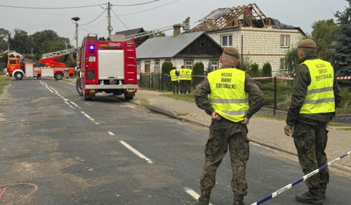 Πυροσβέστες και άνδρες της εδαφικής άμυνας στέκονται κοντά στη κατεστραμμένη στέγη ενός σπιτιού, αφού ρωσικά drone παραβίασαν τον πολωνικό εναέριο χώρο κατά τη διάρκεια επίθεσης στην Ουκρανία, στο Βίρικι κοντά στο Λούμπλιν της Πολωνίας, την Πέμπτη 11 Σεπτεμβρίου 2025. (AP Photo/Rafal Niedzielski)