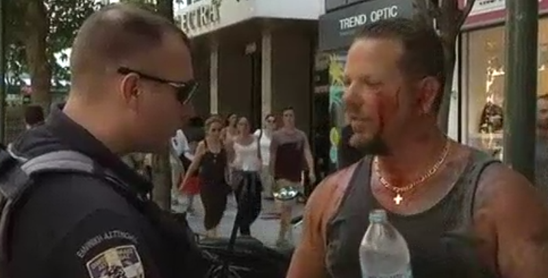 Ο Ελληνοαυστραλός με αίματα στο πρόσωπο και στο σώμα ζητά τη βοήθεια της αστυνομίας, μέρα-μεσημέρι στην Ερμού, καταγγέλλοντας πως του επιτέθηκε ομάδα κουκουλοφόρων επειδή μπήκε σε κατάστημα και ψώνισε.