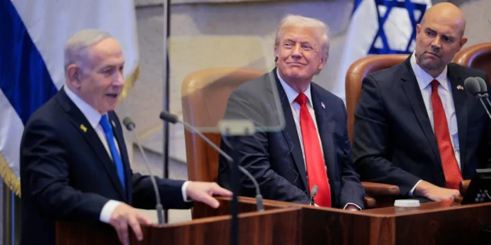 Ο Ντόναλντ Τραμπ παρακολουθεί με ικανοποίηση τον Μπένιαμιν Νετανιάχου στην Κνεσέτ / Φωτογραφία: Chip Somodevilla/Pool via AP