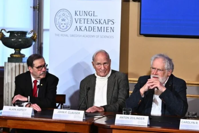 Οι νομπελίστες Άλεν Ασπέ, Τζον Κλάουζερ και Άντον Ζάιλινγκερ κατά τη διάρκεια της συνέντευξης Τύπου στη Βασιλική Ακαδημία της Σουηδίας, στη Στοκχόλμη, στις 7 Δεκεμβρίου (φωτ.: EPA/Claudio Bresciani/ Sweden Out)