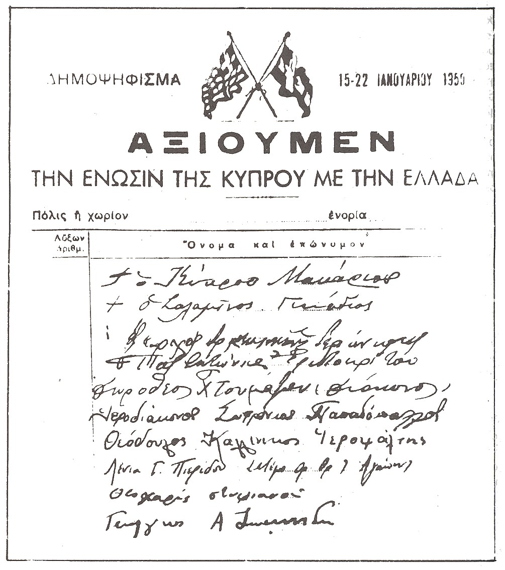 Στις 15 Ιανουαρίου του 1950 έλαβε χώρα το δημοψήφισμα για την Ένωση. Το 1960 ιδρύθηκε η Κυπριακή Δημοκρατία στα πλαίσια ενός μοντέλου συναινετικής δημοκρατίας το οποίο στηριζόταν στην αρχή του δικοινοτισμού και της διοικητικής ομοσπονδίας. Η ανεξαρτησία της Κύπρου ήταν περιορισμένη και δεσμευμένη με την ύπαρξη τριών εγγυητριών δυνάμεων, της Βρετανίας, της Ελλάδας και της Τουρκίας.