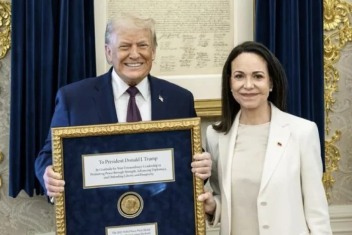 Μέχρι το βράδυ χθες δεν είχε ανακοινωθεί το αποτέλεσμα της συνάντησης της νικήτριας του τελευταίου βραβείου Νόμπελ Ειρήνης, αντιπολιτευόμενης πολιτικού της Βενεζουέλας, Μαρίας Κορίνας Ματσάδο με τον Αμερικανό πρόεδρο. Νωρίς το πρωί ανέβηκαν τα σχετικά βίντεο και η κοινή φωτογραφία. Το πειραγμένο βραβείο, με τη μορφή επιχρυσωμένου κάδρου με το χρυσό μετάλλιο στο μέσο, είχε στο πάνω μέρος ένθετη κάρτα με το όνομα του προέδρου με μεγάλα, ευανάγνωστα γράμματα. Στο κάτω μέρος, σε μικρότερη κάρτα, αναγράφονταν το όνομα της νικήτριας με πολύ μικρότερα. Ο πρόεδρος χαμογελούσε πλατιά. Η νικήτρια σφιγμένα.