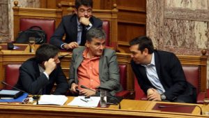 Ο πρωθυπουργός Αλέξης Τσίπρας (Δ) μιλά με τον ΥΠΟΙΚ Ευκλείδη Τσακαλώτο (Κ) και τον ΑνΥΠΟΙΚ Γιώργο Χουλιαράκη (Α) στη συνεδρίαση της Ολομέλειας της Βουλής κατά τη συζήτηση και ψήφιση των μέτρων για το κλείσιμο της β’ αξιολόγησης, Αθήνα, την Τετάρτη 17 Μαΐου 2017, ΑΠΕ-ΜΠΕ, Aλέξανδρος Μπελτές